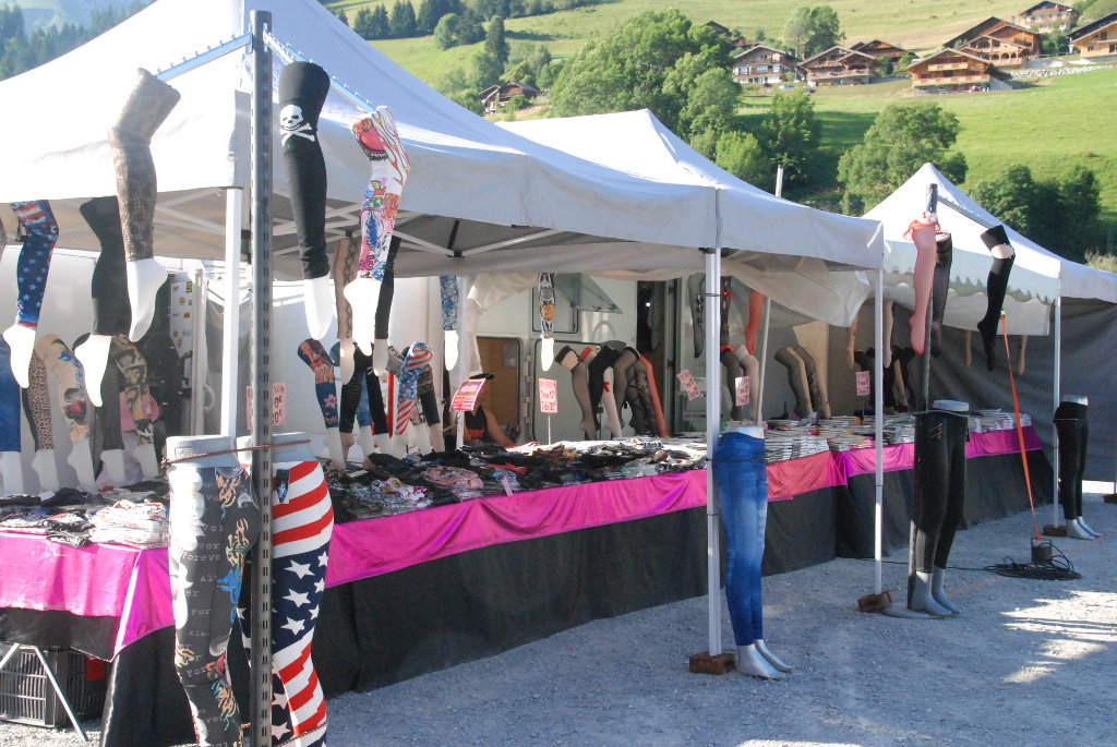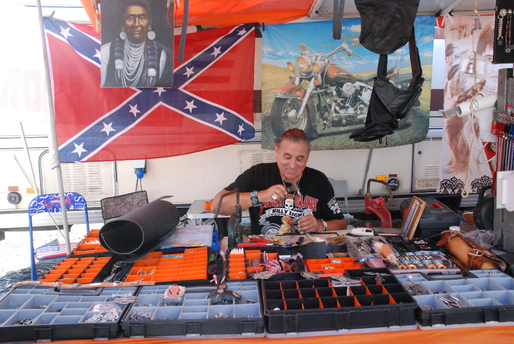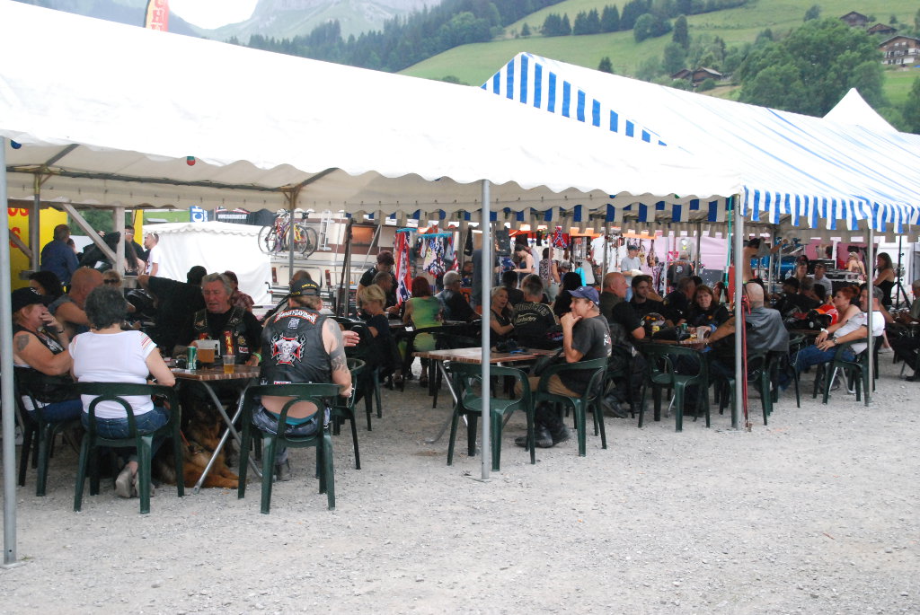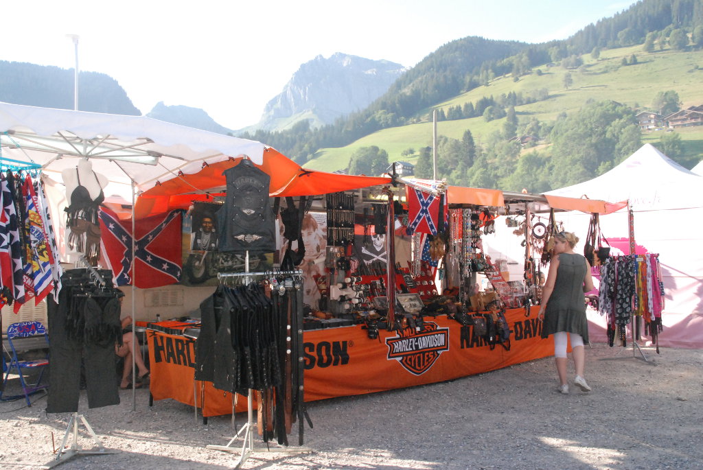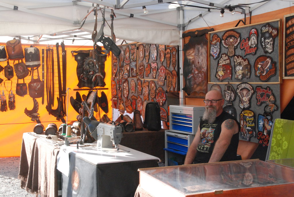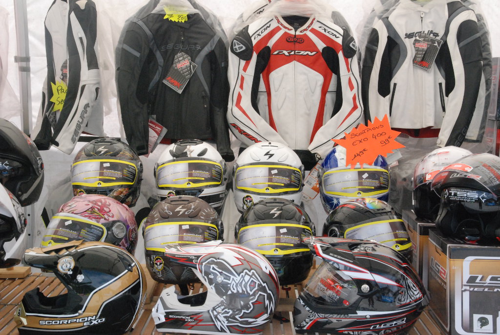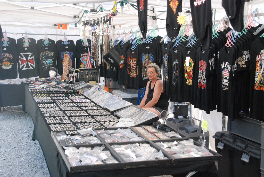 Catering and bar, clothing and motorcycle accessory sales stands.